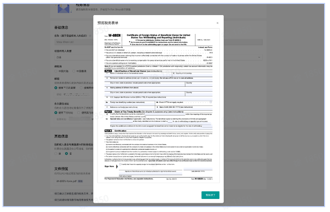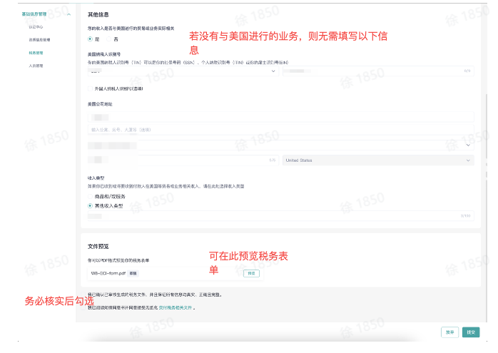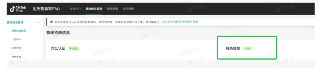 进入卖家中心系统-【基础信息管理】–【税务信息】填写相关信息并提交W8税表
