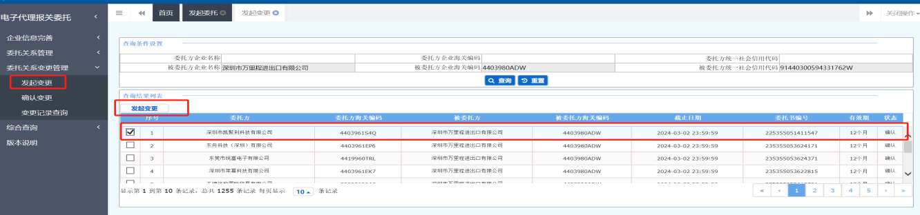 点击发起变更,点查询或者直接输入被委找方公司名称点查询,找到被委托方公司名勾上,然后点发起变更,进入到变更页面后勾上辅助查验,点击右上角“发起变更”就可以了