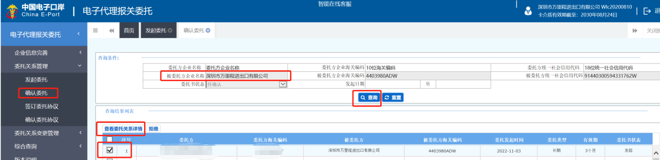 点击确认委托,输入被委找方公司名称点查询,找到被委托方公司名勾上,然后点查看委托关系