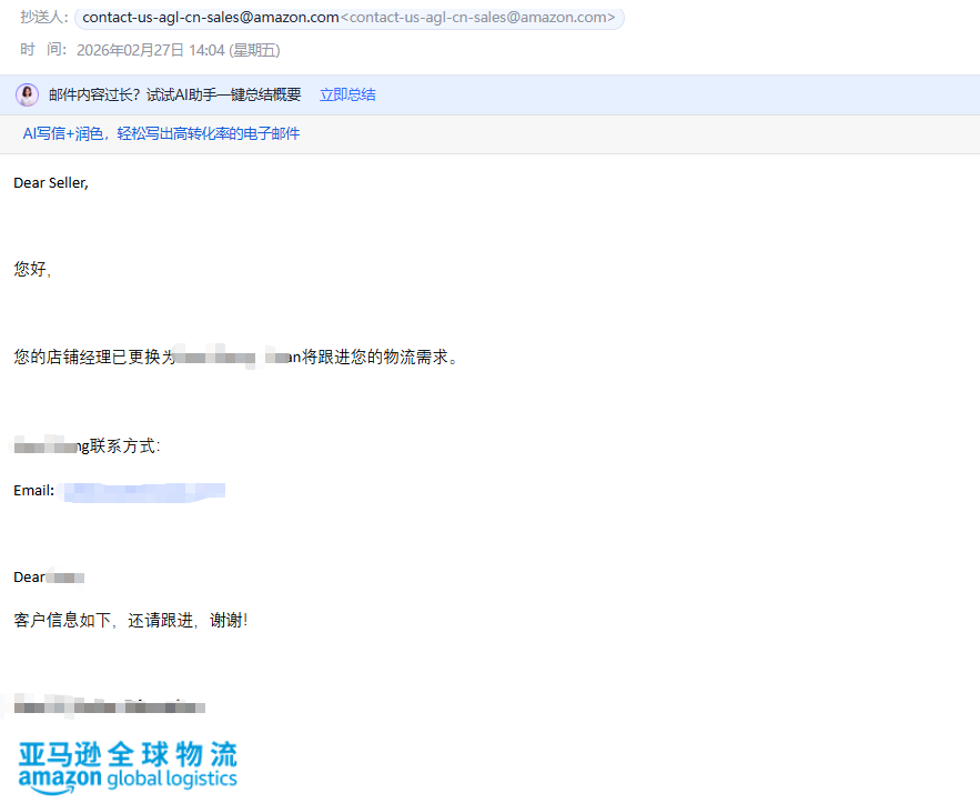 我是 [您的公司名称/店铺名称] 的负责人,目前正在使用亚马逊全球物流(AGL)服务。我们的卖家 ID 为:[填写您的 Seller ID]。